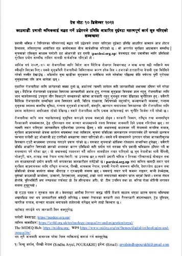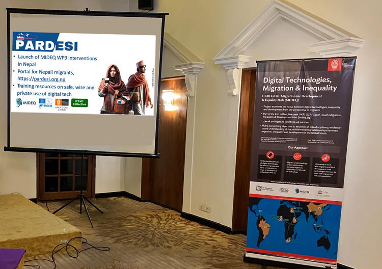 10 December 2023, Lalitpur, Nepal: The launch of the digital tech interventions for Nepali migrants facilitated by Work Package 9 of the MIDEQ Hub took place today in the Hotel Himalaya, Lalitpur. Eighty participants from government, civil society, the private sector, international organisations and digital tech students attended. The two key interventions that Hari Harindranath, Tim Unwin and Maria Rosa Lorini (from the ICT4D Collective and Royal Holloway, University of London) had helped their Nepali colleagues to create were presented: the https://pardesi.org.np portal, which is a one-stop-shop for migrants and their families to find out about all aspects of the migration process; and resources that can be used to train migrants in the safe, wise and secure (or private) uses of digital tech, which have been designed to be especially useful in the Migrant Resource Centres.