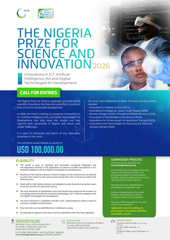 Do you know anyone involved in the application of science to support innovations in ICT, AI and digital tech for development. If so, do encourage them to submit an application by 30 April 2026 for THE NIGERIA PRIZE FOR SCIENCE AND INNOVATION. Details are in the image below, or find out more at https://www.thenigeriaprizes.org/the…/nps_call_for_entry/. The award is worth $100,000.