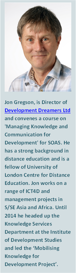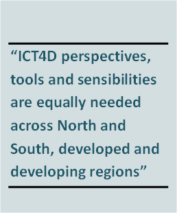 The world is now characterised by news and social media platforms’ intent on delivering alternative facts, fake news and fake research results. Alongside this they harvest insights through algorithms that analyse our online behaviours and preferences. ‘Big data’ becomes big business driven by a global internet machine which if we are not careful will support the interests of ‘the few not the many’ (to turn around an overused party-political phrase!). So, what are our options for creating a future where we can retain a sense of identity, values and freedoms? I certainly do not claim to have the solutions to such huge global challenges facing society, but offer three suggestions to the ICT4D community, all of which underpin the way knowledge can be created and shared in a digital age: