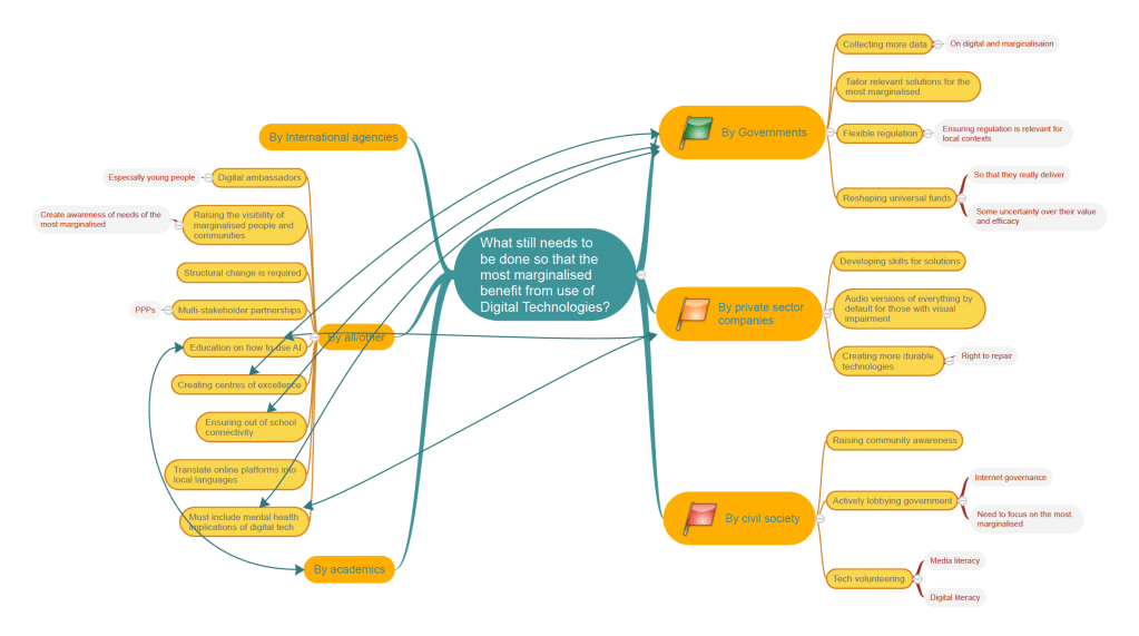 Lively introductory thought-provocations were given by Erica Moret (Microsoft), Bazlur Rahman (BNNRC), Paul Spiesberger (ict4d.at) and Yuliya Morenets (Youth.IGF), and the main focus of the session was then to create together a mind map from brainstorming by participants both in the room and also online (as well as using post-its). This generated a wide range of positive and constructive ideas for what we all need to do if we really care about helping the most marginalised use digital technologies to improve their lives. This discussion is summarised below (click on image for full sized .pdf file):