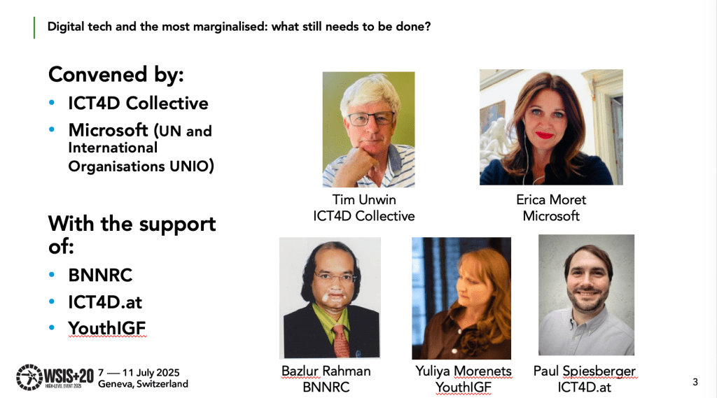 The ICT4D Collective and Microsoft (UN and International Organisations UNIO) (supported by Bangladesh NGOs Network for Radio and Communication, ICT4D.at, and YouthIGF) convened a very lively and interactive Session 360 this morning at the WSIS+20 gathering at Palexpo in Geneva. This began by recognising that digital tech will not be used successfully to deliver the SDGs (especially SDG10) by 2030, but then focused in a very positive way on what governments, the private sector and civil society can indeed do to try to ensure that the poorest and most marginalised can use digital tech to improve their lives.