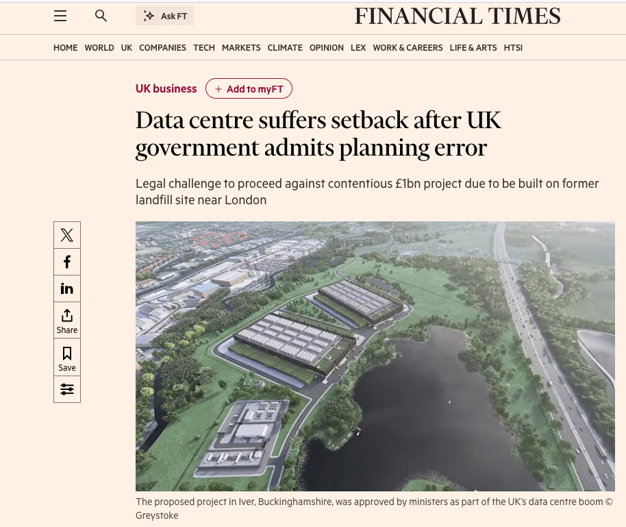 Data centre suffers setback after UK government admits planning error, Financial Times, 22 January 2026