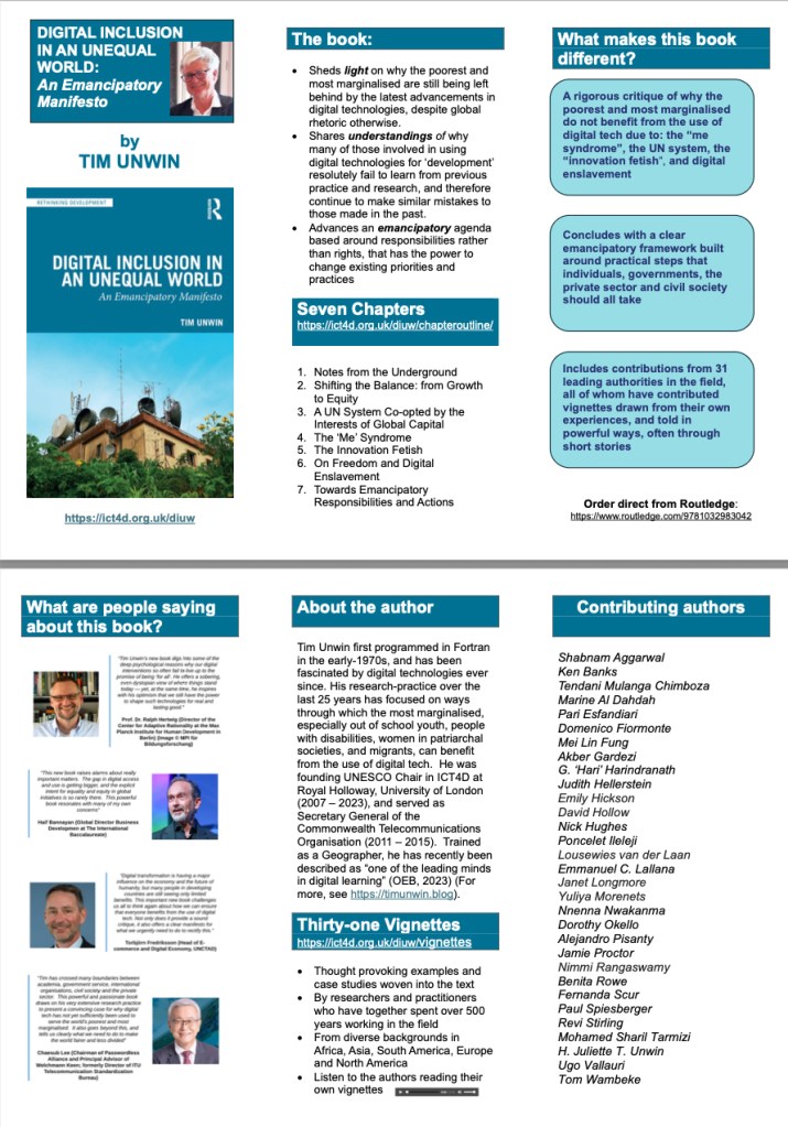 Digital Inclusion in an Unequal World: An Emancipatory Manifesto forms the third part of an unintended trilogy, and builds on two of Tim Unwin’s earlier books on digital tech and development.