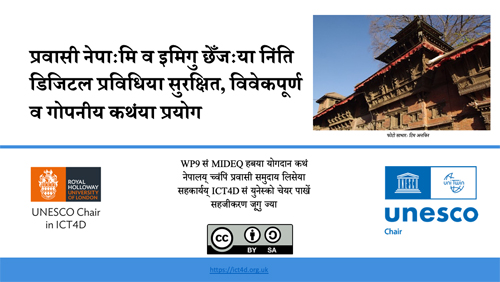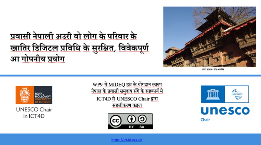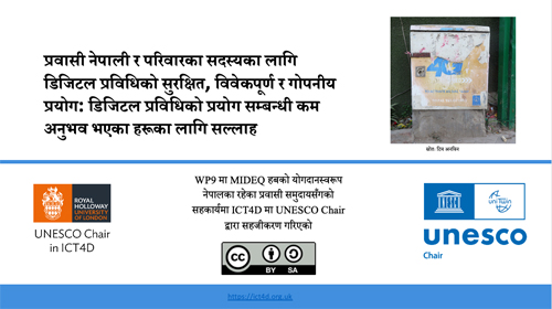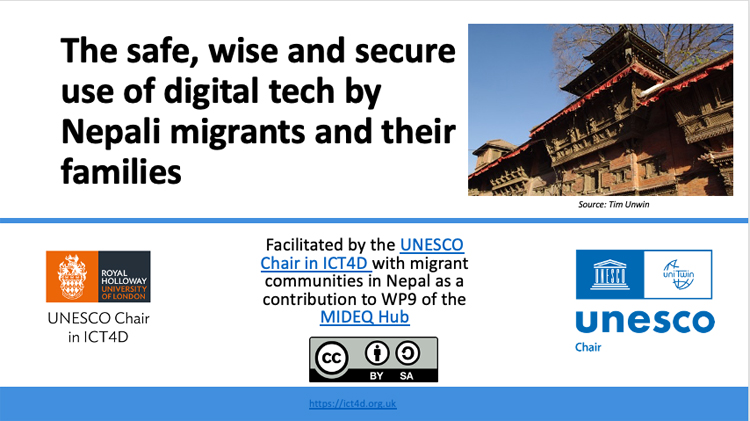 Our work in Nepal began as part of the MIDEQ project between 2019 and 2014. Our workstream was led by Prof. “Hari” Harindranath supported by Dr. Maria Rosa Lorini and Tim Unwin. We worked together with our Nepali colleagues to craft training resources for migrants in the safe, wise and secure use of digital tech, as well as developing an integrated portal https://parsdesi.org.np to provide links to the many existing sources of information of relevance to migrants.