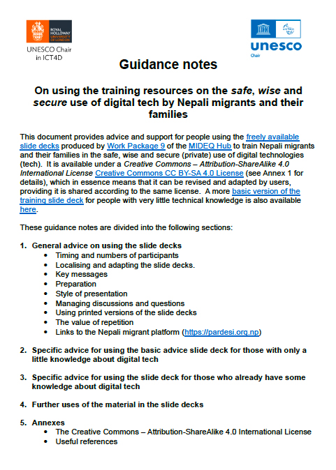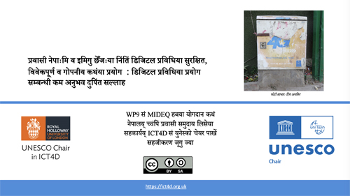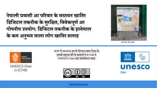 Working together, and drawing on existing good practices globally, we developed a slide-deck in Nepali and English (under CC BY-SA licence) that anyone can use to train migrants in the safe, wise and secure use of digital tech. This was originally designed to be used for training migrants and their families in the centres that they attend prior to departure, but we have also developed a range of other materials (including pamphlets and posters) that draw on these basic principles. Click on the images below to see .pdf versions of the slide decks (or download .pptx files from the links beneath). The deck has now been translated into the six main Nepali languages, Nepali, Maithili, Bhojpuri, Tharu, Tamang and Nepal Bhasa (Newar), alongside English.
