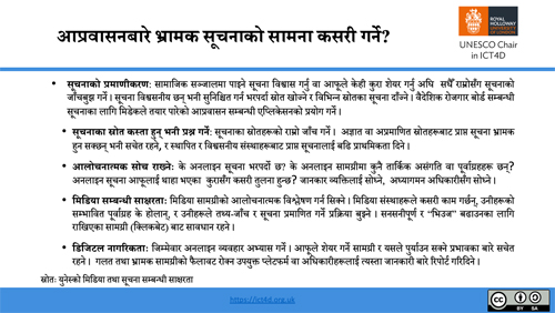 The above slide decks were originally designed as a basic template that could have material added to them, and so that they could be readily reversioned to suit the needs of the groups who wished to use and develop them. We are very grateful to our colleagues in UNESCO Nepal who prepared this slide (in English and Nepali) on combatting misinformation.