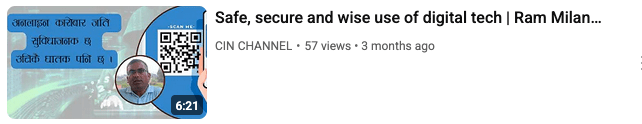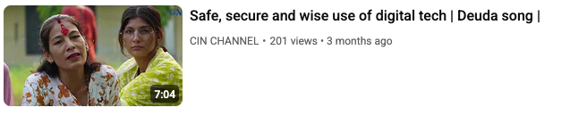 Watch or listen to the resources ACORAB has developed based on our materials and shared on their dedicated YouTube Channel on Safe, Wise and Secure use of digital tech in multiple languages used in Nepal. Click on the images below to link directly to the relevant media on the channel, under three headings: Videos, Radio Programmes and Public Service Announcements (PSAs) (views and dates on images are as of September 2025 – by that date our resources had been viewed more than 2,700 times).