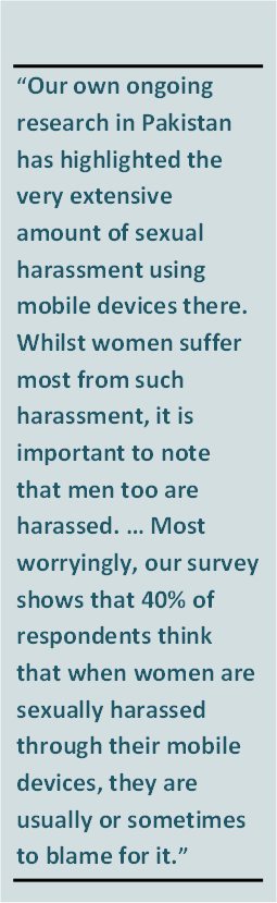 Third, there is good evidence that online sexual harassment is much more widespread than is often thought, particularly in the conservative societies of North Africa, the Middle East and South Asia as reported by the BBC in their recent stories on sex, honour and blackmail in an online world.  Our own ongoing research in Pakistan has highlighted the very extensive amount of sexual harassment using mobile devices there.  Whilst women suffer most from such harassment, it is important to note that men too are harassed.  Interestingly, preliminary results from our online survey suggest that although social media are used for harassment, most often it occurs through calls and text messages.  The implications of posting images on social media have recently been highlighted by the apparent honour killing of Pakistani model Qandeel Baloch, but this is just the tip of an iceberg, with many women in Pakistan living in fear of retribution should family members see imagery that others may have posted.  Most worryingly, our survey shows that 40% of respondents think that when women are sexually harassed through their mobile devices, they are usually or sometimes to blame for it.